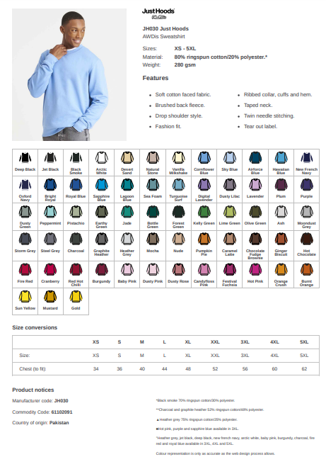 Personalize this sweatshirt by choosing any colour and design. Ideal for presents, you can even incorporate your own illustrations or handwriting for a one-of-a-kind look. Crafted from a blend of 80% ring spun cotton and 20% polyester, it is made of soft cotton faced fabric with brushed back fleece. It boasts a drop shoulder design, ribbed collar, cuffs and hem, and reinforced taped neck for increased longevity.