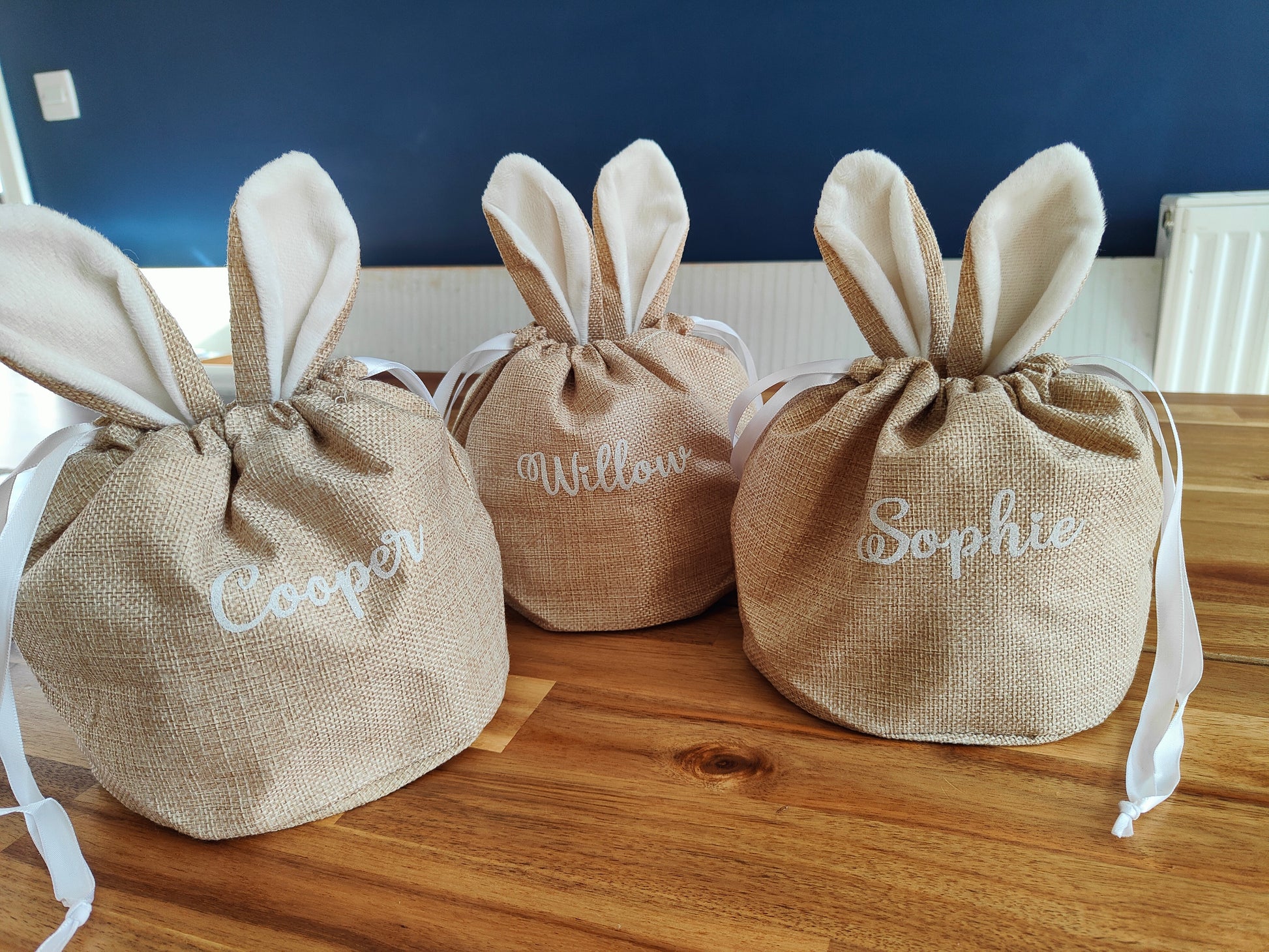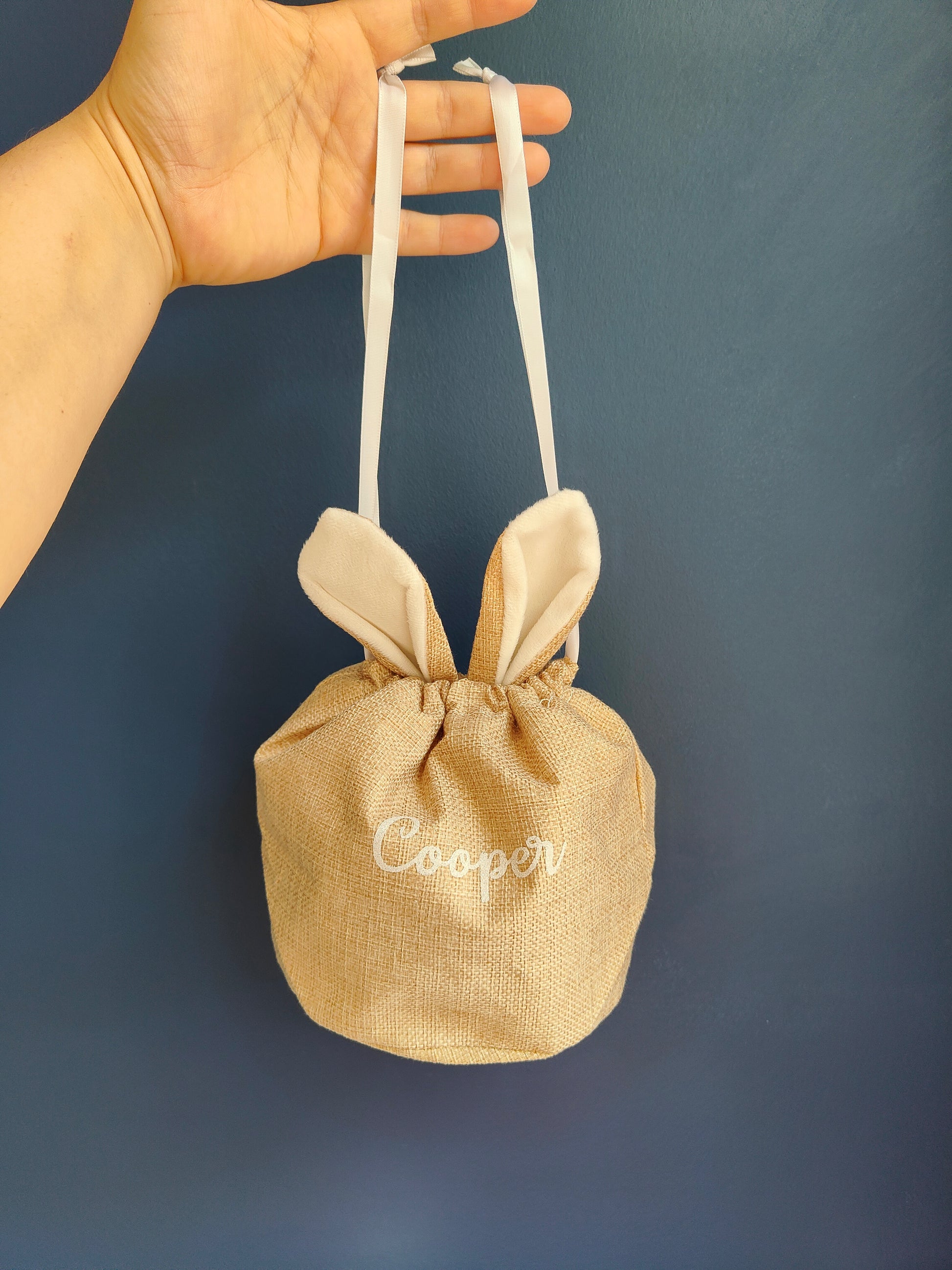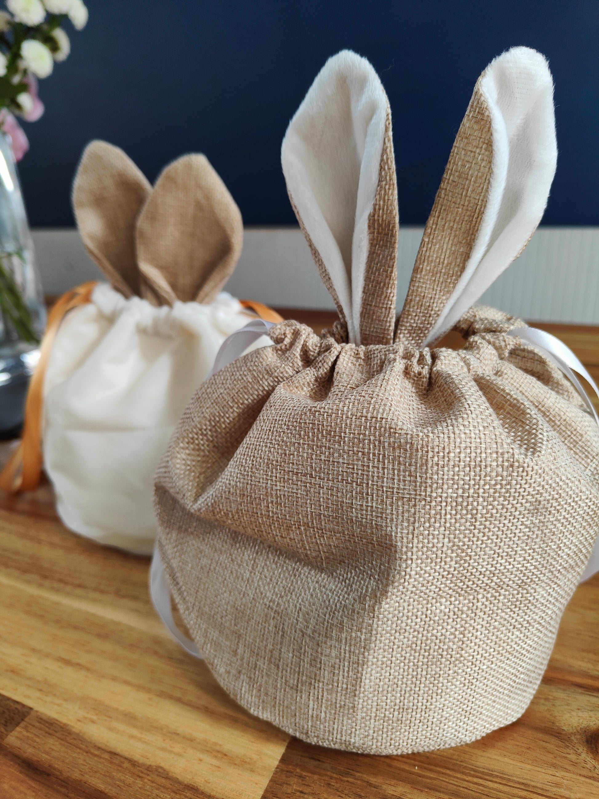 Elegant bunny bags featuring a convenient pull string handle design. Available in both soft white and striking hessian fabric, these bags can be personalised with the name of your choice for a unique touch.