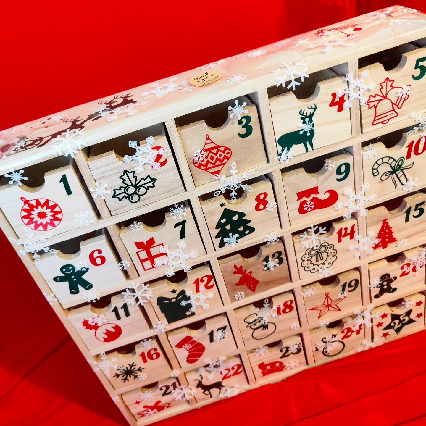 The festive numbers and Christmas-themed pictures on the drawers add a festive and cheerful atmosphere to the advent calendar, making it a fun and exciting way to countdown to Christmas. The moveable drawers also provide a sense of anticipation and excitement for the recipient, as they wait to open each drawer and discover what's inside.